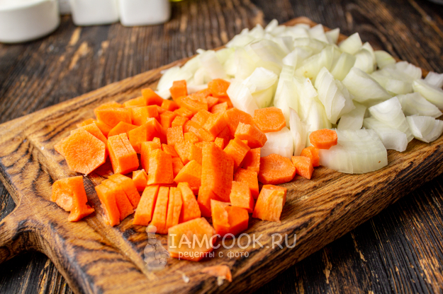Очистите лук и морковь, нарежьте также среднего размера кусочками.