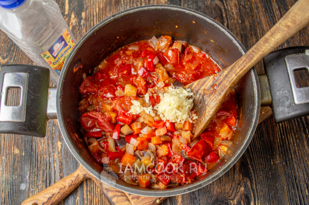 По истечении времени соус значительно уварится, овощи станут мягкими. Влейте уксус, добавьте чеснок, пропущенный через пресс, и тушите еще 5 минут.