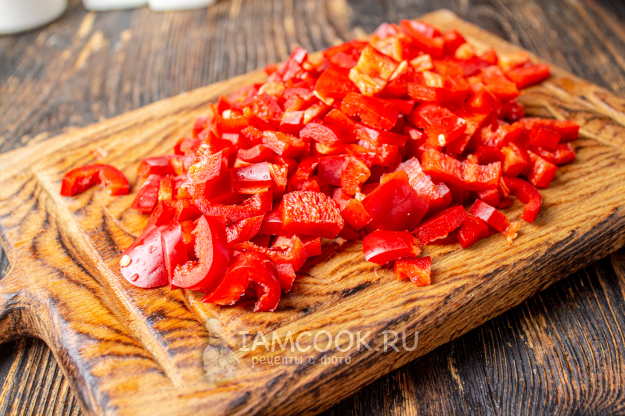 Сладкий перец нарежьте тонкими короткими полосками. Можно использовать и красный, и зеленый перец.