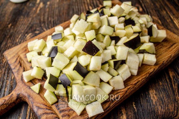 Баклажаны нарежьте средним кубиком. Нарезка овощей не мелкая, ближе к средней.