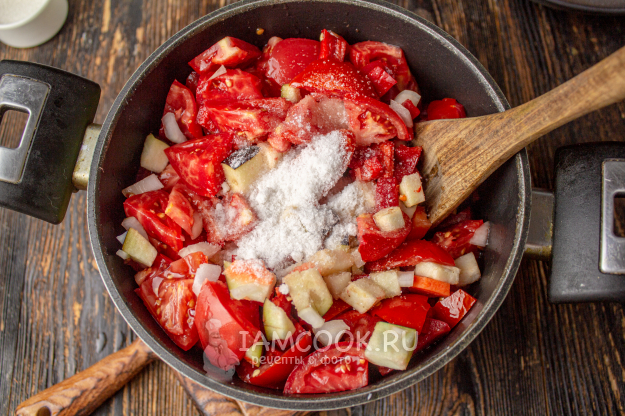 Все подготовленные овощи сложите в кастрюлю с толстым дном, влейте масло, добавьте соль и сахар. Поставьте на плиту, доведите до кипения и тушите при слабом нагреве 30-40 минут. Не забываем периодически помешивать. Если вы видите, что соус сильно уваривается, то можно влить немного воды. Следите, чтобы овощи не подгорели, не жарились, а именно тушились.