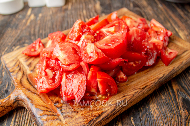 Помидоры выберите сочные и спелые, нарежьте их тонкими дольками.