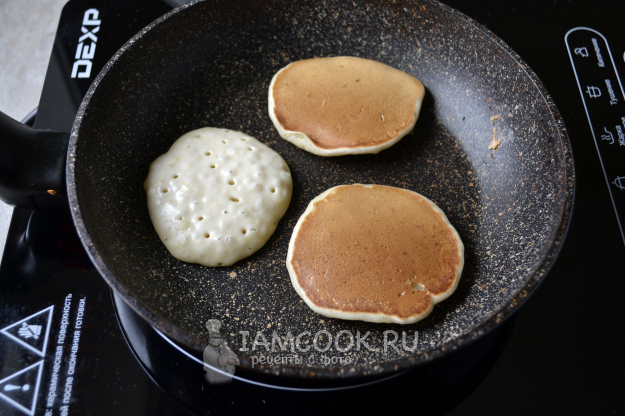 На огне ниже среднего обжаривайте панкейки до того момента, как на поверхности появятся пузырьки. Переверните панкейки и продолжайте обжаривать со второй стороны до готовности.