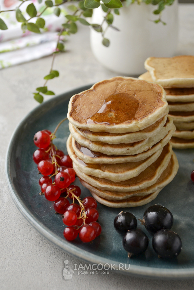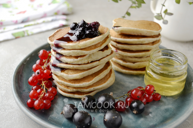 Банановые панкейки без молока, яиц и кефира готовы. Подавайте их со свежим вареньем, медом, джемом, сгущенным молоком.