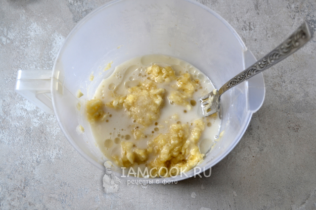 Перемешайте банановое пюре с маслом и влейте половину овсяного молока. Перемешайте.