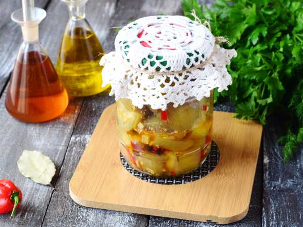 Сразу же накройте банку горячей крышкой и укупорьте на зиму ключом для консервации либо прокрутите крышку по резьбе. Остудите при комнатной температуре и перенесите в кладовую к остальным заготовкам - баклажаны в острой заливке на зиму готовы.