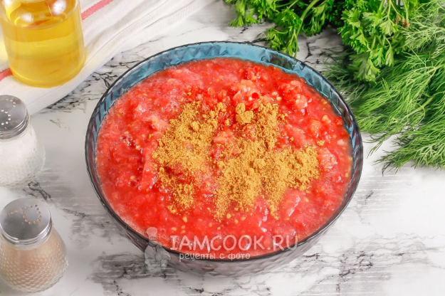 Всыпьте приправу для шашлыка и тщательно размешайте. По желанию ее можно заменить другой приправой, молотыми сушеными травами или специями.