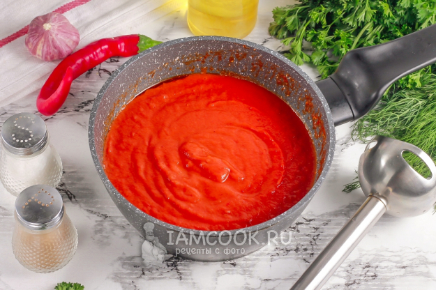 Пюрируйте с помощью погружного блендера - кетчуп станет густым, однородным. Накройте емкость крышкой и на минимальном нагреве проварите всё еще 5-10 минут.