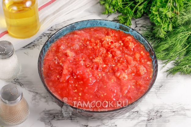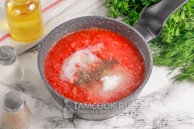 Перелейте томатную массу в ковш и всыпьте соль, сахар, молотый черный перец, перемешайте. Поместите емкость на плиту и доведите ее содержимое до кипения. Затем убавьте нагрев и на умеренном нагреве тушите примерно 1 час. Обязательно помешивайте всю массу раз в 10 минут. Когда масса уварится в несколько раз, помешивайте чаще, чтобы она не подгорела. На дне емкости соберется гуща, а сверху будет томатный сок.