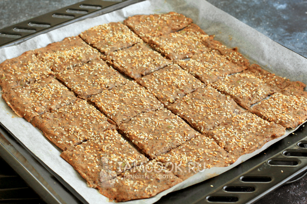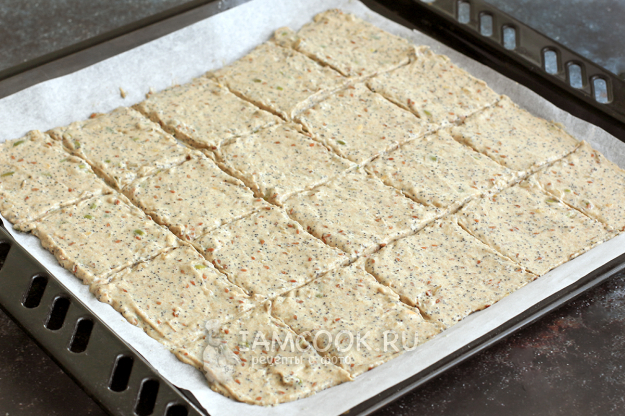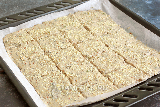 Старайтесь сделать слой равномерным по всей поверхности, чтобы хлебцы получились одинаковой толщины. Сделайте надрезы ножом или лопаткой, формируя квадратики.