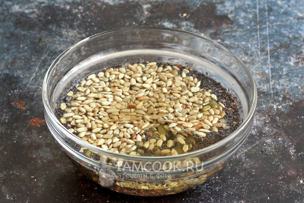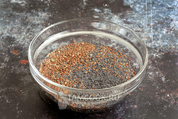 Льняное семя и мак залейте водой, добавьте соль и щепотку сахара. Перемешайте, чтобы семена опустились на дно, и оставьте на 1 час для набухания.