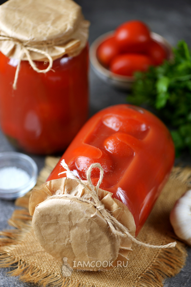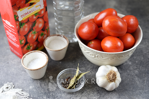 Подготовьте необходимые продукты для заготовки маринованных помидоров в томатном соке на зиму.