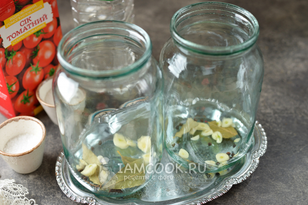 Банки простерилизуйте, прокипятите крышки. На дно каждой банки положите по 2 гвоздики и лавровых листа, разделите пополам перец горошком, нарежьте чеснок тонкими ломтиками.
