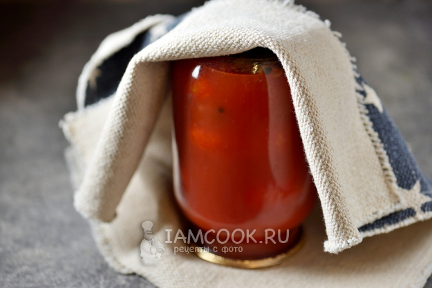 В каждую баночку добавьте по чайной ложечке уксуса, залейте доверху кипящим томатным соком и закрутите крышки ключом. Баночку протрите мокрой тряпкой, чтобы убрать потеки сока, переверните вверх дном и укутайте теплым одеялом до следующего дня.