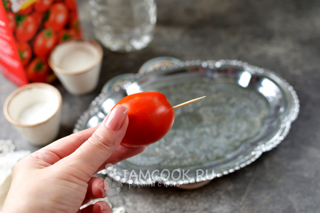 Каждый помидор наколите несколько раз в области плодоножки бамбуковой зубочисткой.