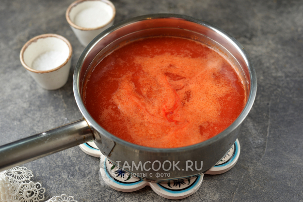 В сотейник отмерьте необходимое количество томатного сока, но добавьте чуть больше, поскольку его нужно наливать в банки под самое горлышко, сока уйдет практически весь литр. Доведите томатный сок до кипения, соберите пену, всыпьте соль без горки и сахар, растворите их, помешивая ложкой.