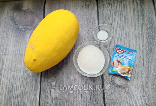 Пропорции продуктов для приготовления варенья из дыни с желатином на зиму - в списке ингредиентов.
