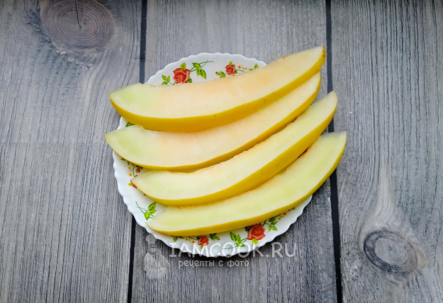 Дыню помойте, удалите семечки и нарежьте вдоль полосками толщиной 1,5-2 сантиметра.