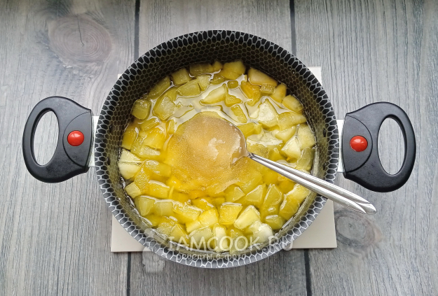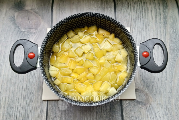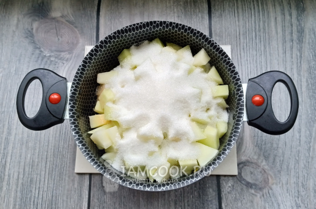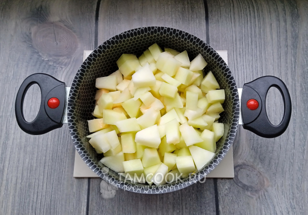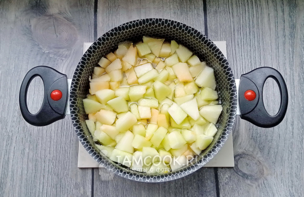 Обрежьте корку, нарежьте дыню кусочками и выложите в кастрюлю.