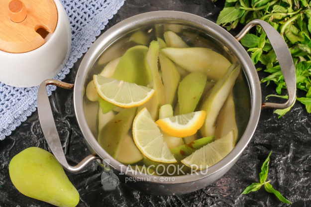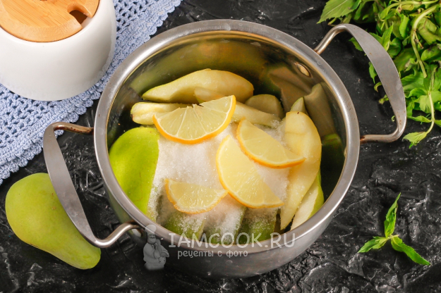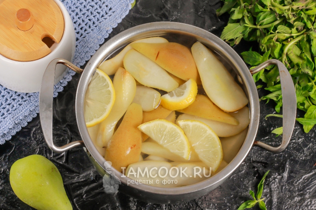 Нарежьте лимон ломтиками, удалите косточки и выложите нарезку в кастрюлю к грушам.