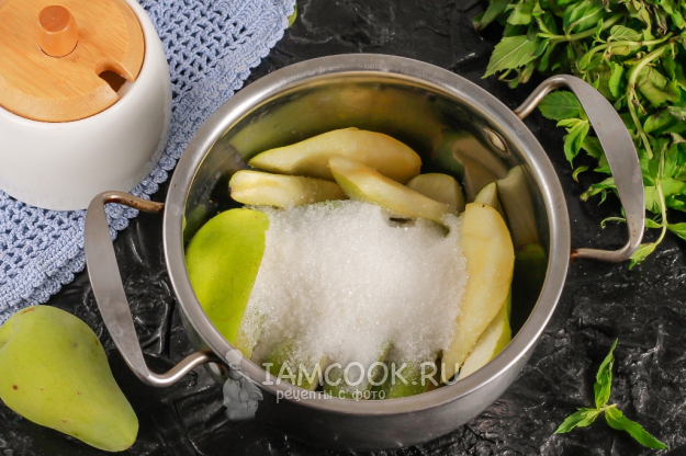 Выложите фруктовую нарезку в кастрюлю или ковш, всыпьте сахар. Старайтесь все манипуляции проводить быстро, так как мякоть груш может потемнеть.