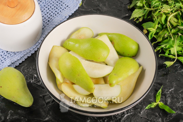 Зеленые груши промойте в воде и разрежьте на четвертинки. Из каждой из них вырежьте семенные блоки и потемневшие места, если таковые присутствуют.