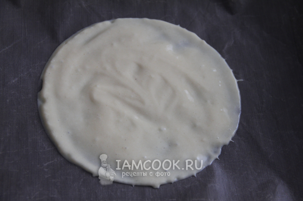На пергамент или коврик выложить полторы столовые ложки теста и сформировать круг, я воспользовалась металлическим кольцом. Диаметр - 18 см.