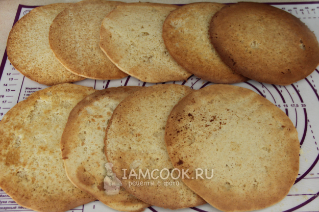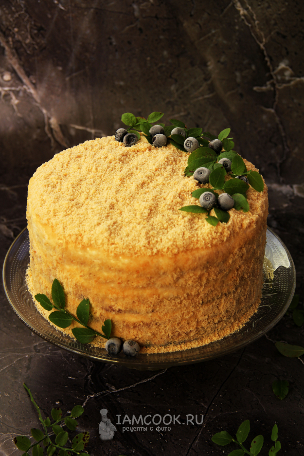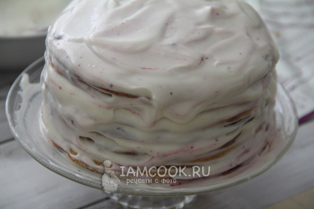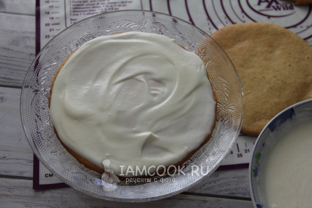 Обмазать торт сметанным кремом. Для более ровного края можно зажать торт в металлическое кольцо. Оставить торт для пропитки в холодильнике на ночь.