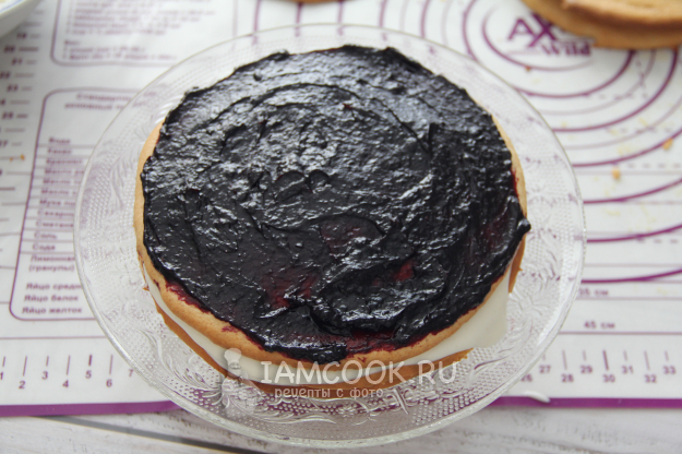 Собрать торт. Смазать коржи сметанным кремом, чередуя с черничным конфи.