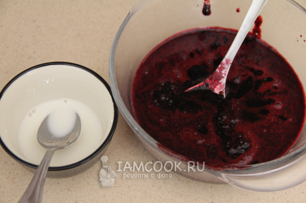 Откинуть ягодную массу на сито и перетереть. Нам нужно ягодное пюре, жмых выкинуть. Крахмал развести в 2 столовых ложках холодной воды.