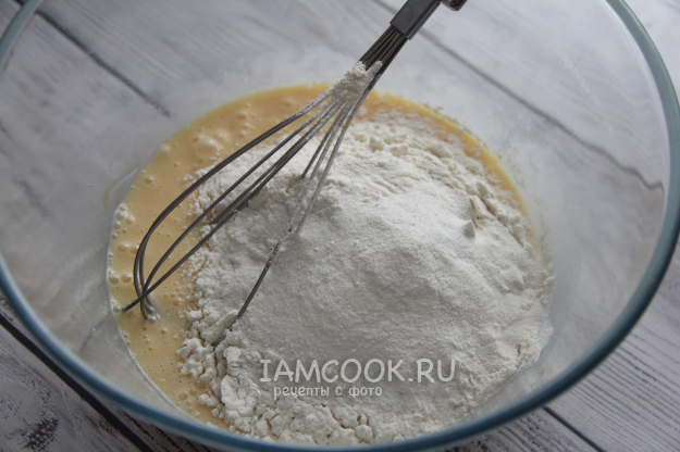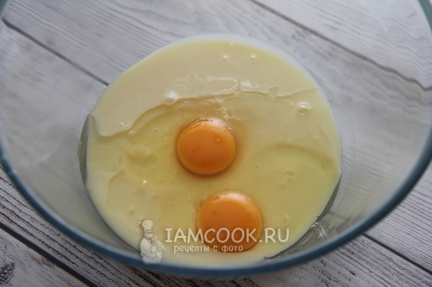 Для теста соединить в миске сгущенку и яйца. Перемешать венчиком.