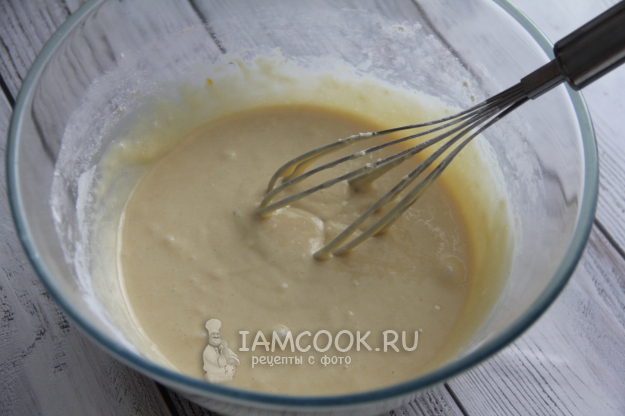 Перемешать тесто венчиком. Оно получится тягучим и липким.