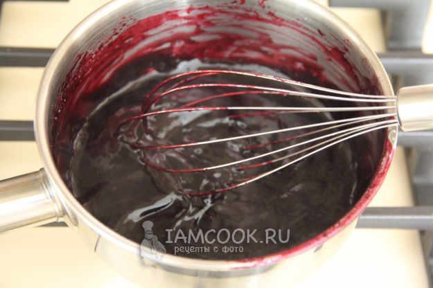 Влить в ягодную массу крахмал и перемешать венчиком. Масса на огне загустеет. Снять конфи с огня и переложить в миску, накрыв пленкой в контакт.
