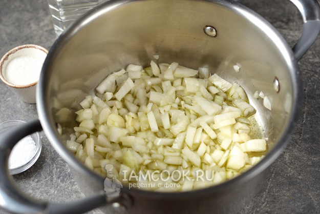 Кастрюлю с толстым дном поставьте на огонь, влейте растительное масло, выложите в него нарезанный кубиком репчатый лук. Жарьте на умеренном огне минуты 3-4, он должен стать прозрачным.