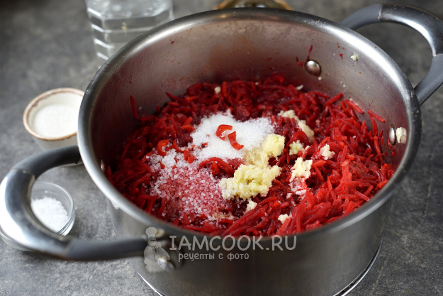 За это время овощи хорошо протушатся, теперь положите в кастрюлю сахар, соль без горки, пропущенный через пресс чеснок и нарезанный перчик чили. Чили я очистила от семечек, чтобы икра не была слишком острой. Тушите острую свекольную икру еще 5-7 минут на тихом огне.
