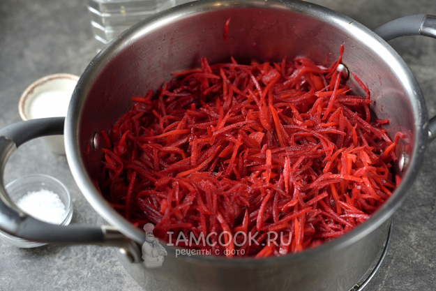 Свеклу натрите такой же тонкой стружкой, добавьте в кастрюлю, при необходимости уменьшите огонь до минимума, тушите 5 минут, часто перемешивая овощи.