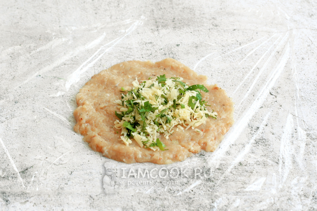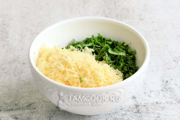 Подготовьте начинку. Для этого натрите на средней терке твердый, легко плавящийся сыр, добавьте измельченную зелень и перемешайте.