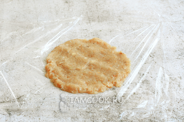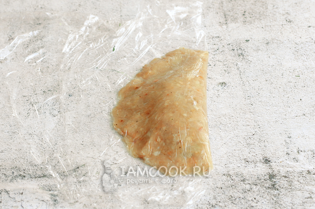 Расстелите кусок пищевой пленки на столе, лучше сделать сразу два комплекта. На пленке распределите выпуклой частью мокрой ложки куриный фарш, диаметром около 12 см, разровняйте. Воду для ложки держите поблизости.