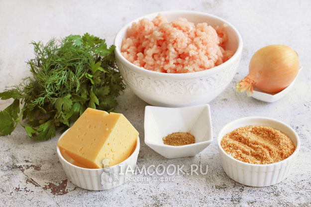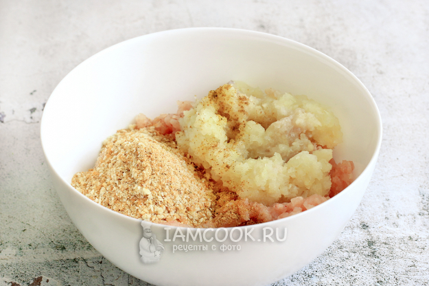 Куриный фарш соедините с панировочными сухарями, измельченным луком и зубчиком чеснока. Добавьте все специи, соль и перемешайте до однородности. Лук можно измельчить вместе с мясом на мясорубке или натереть на мелкой терке отдельно.