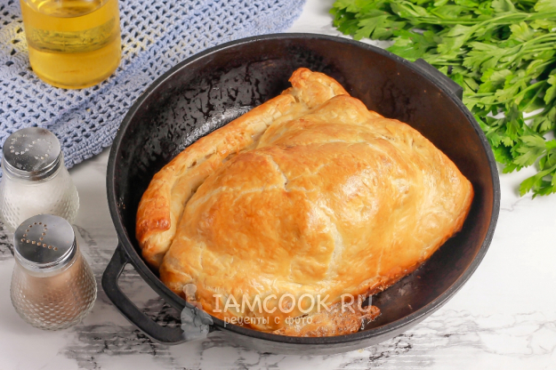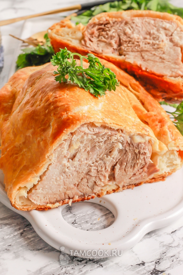 Чтобы проверить готовность блюда, всуньте деревянную шпажку в середину выпечки и извлеките. Если на ней нет крови, значит мясо пропеклось. Если кровь еще присутствует, а корочка теста уже достаточно подрумянилась, то прикройте блюдо фольгой или пекарской бумагой и запеките дальше до готовности.