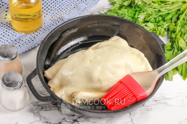 Взбейте куриное яйцо и смажьте им поверхность теста для получения золотистой корочки. Это можно сделать и за 5 минут до готовности - не принципиально.