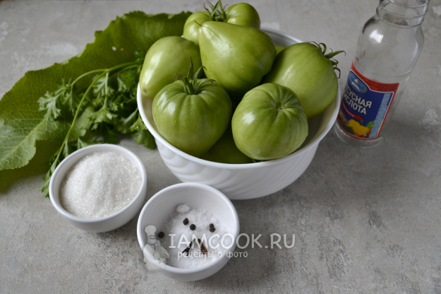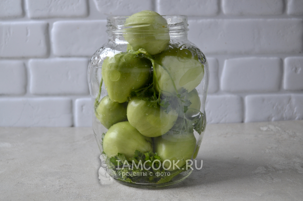 Продукты для заготовки сладких маринованных зеленых помидоров на зиму - перед вами. Помидоры, лист хрена и петрушку тщательно вымойте.