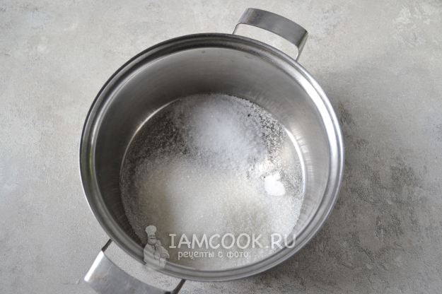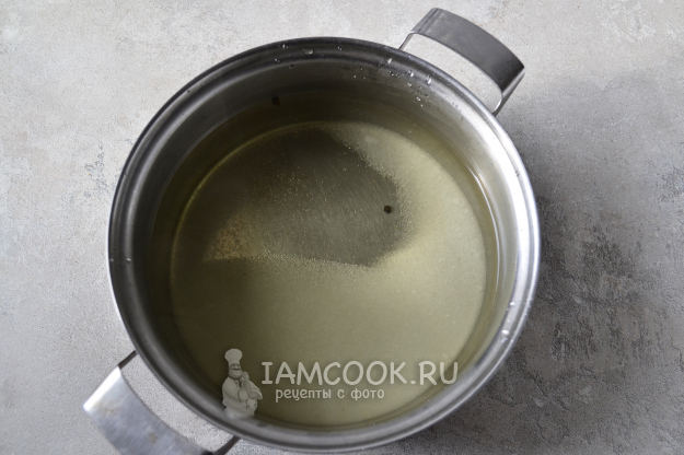 Слейте воду из банки и поставьте кастрюлю на огонь. Доведите до кипения, прокипятите пару минут, чтобы сахар и соль растворились, снимите с огня и только потом влейте уксус.