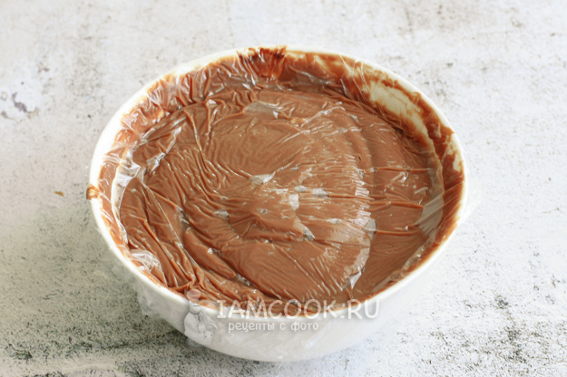 Тщательно растворите шоколад в горячем креме, перелейте в холодную емкость, а затем накройте его пленкой в контакт и полностью остудите до комнатной температуры.