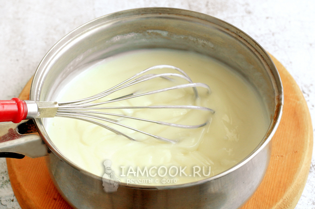 Я делаю очень простой заварной крем. В малом количестве молока соединяю сахар, ванилин, крахмал (муку) и яйцо. Хорошенько взбиваю венчиком до полного объединения, а затем доливаю оставшееся молоко комнатной температуры и сразу ставлю на огонь. Не переставая работать венчиком, нагревайте молочную смесь до кипения, не отходя от нее ни на секунду, так как подгореть все это может очень быстро.
