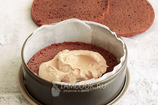 Соберите торт в кольце, тогда он получится ровным и не будет заваливаться на бок. Нижний корж пропитайте сиропом, выложите крем и разровняйте. Повторите все со вторым коржом, а поверхность третьего коржа не пропитывайте.