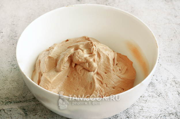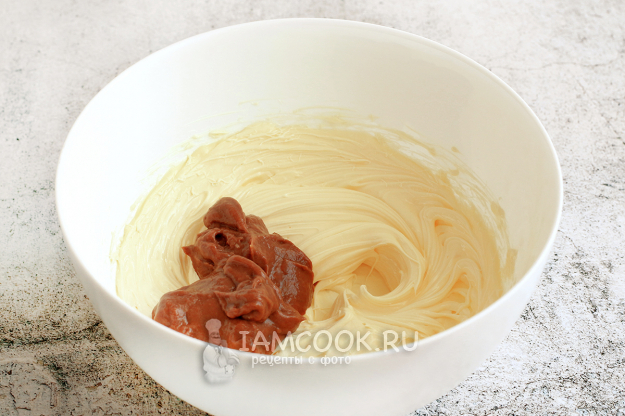 Размягченное сливочное масло взбейте добела и пышности миксером, а затем добавляя частями шоколадную заварную основу, продолжайте взбивать до получения пышного крема для торта.
