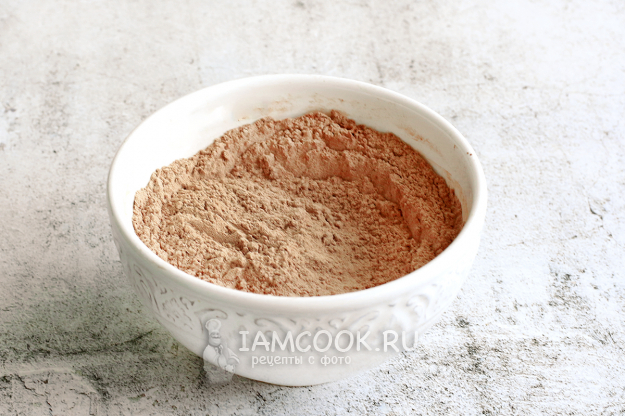 Сначала просейте муку и какао в одну емкость, добавьте соль, разрыхлитель и ванилин. Перемешайте, это удобно и легко делать ручным венчиком.