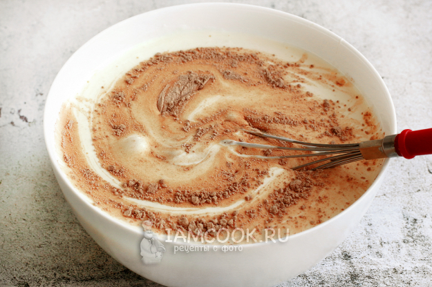 Постепенно добавляйте мучную смесь с какао, в несколько приемов. Размешивайте тесто ручным венчиком, миксер уже не используйте.