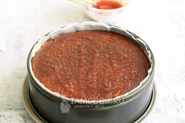 Смажьте верхний корж абрикосовым джемом. Конечно, можно и не смазывать, только это будет уже не торт "Прага". Поставьте торт на полчаса в холодильник или на 15 минут в морозилку.